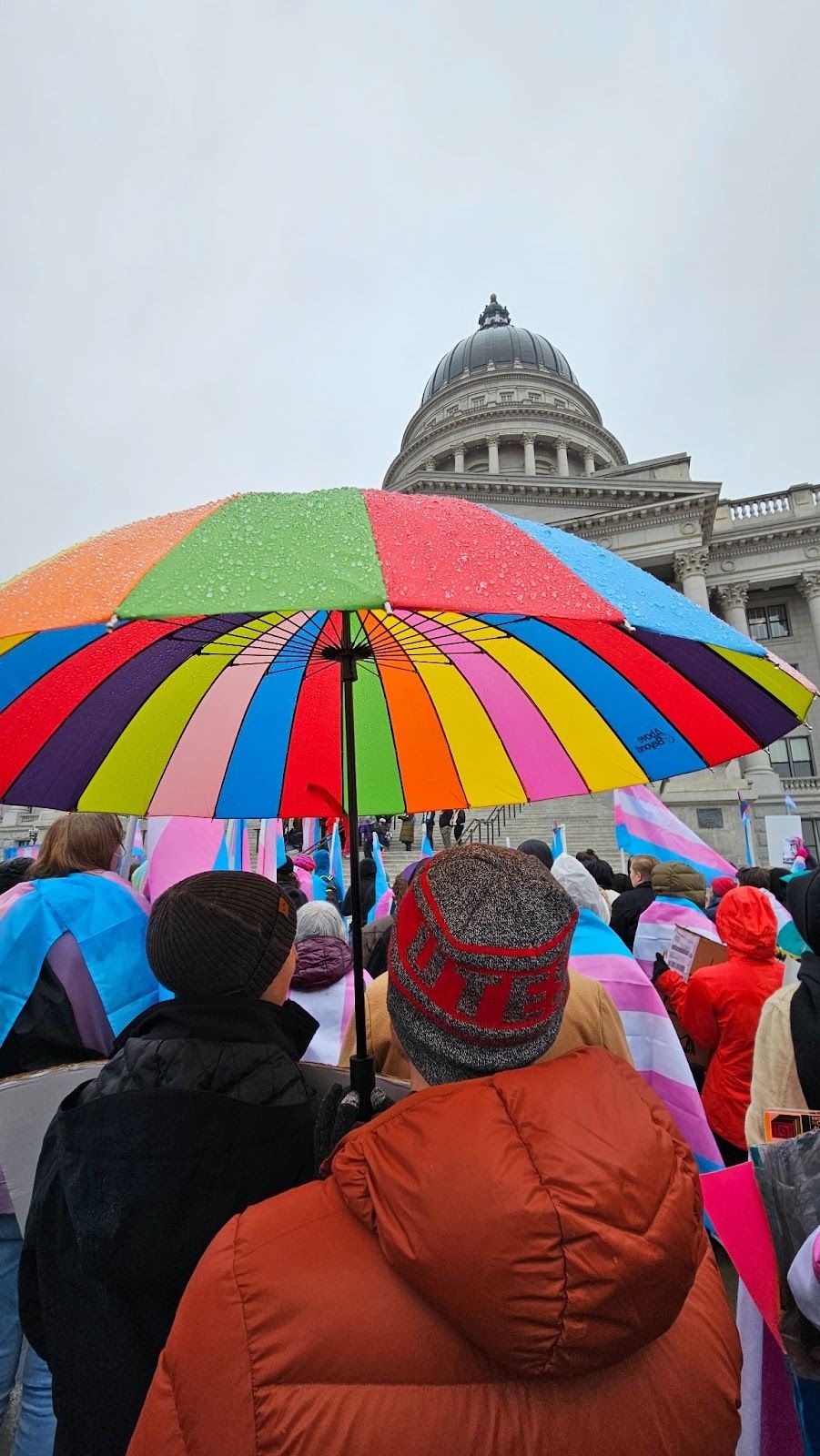 Utahns standing at the bottom of the steps of the state capitol in the rain